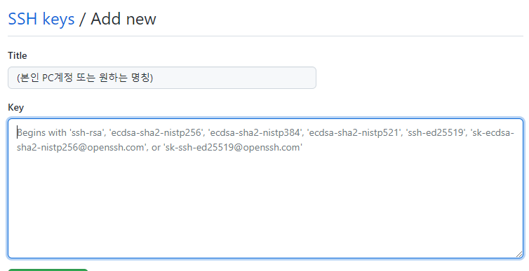 - New SSH Key 버튼 클릭 하고 복사한 전체 키 붙여 넣고 [Add SSH key]