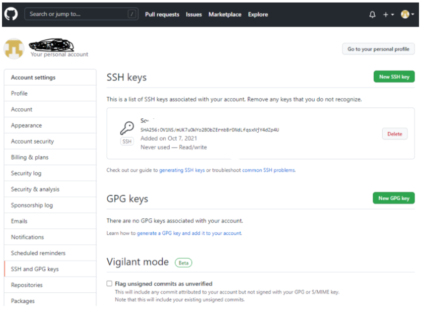 - 우측 상단 본인 계정 클릭 > Settings > SSH and GPG keys 클릭