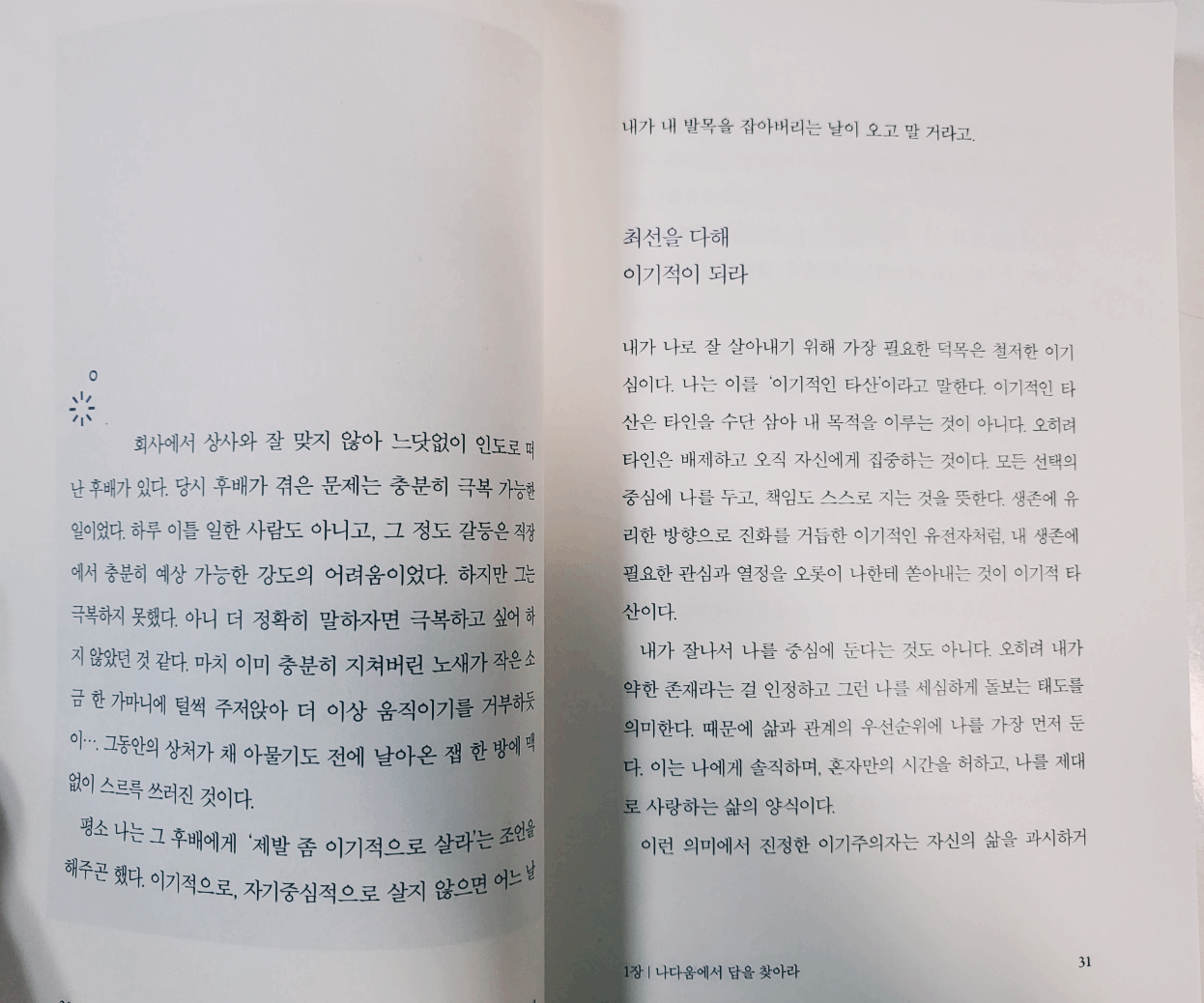 이 책을 덮을 즈음, 나는 이 책의 부제를 '나에 대해 오롯이 집중하는 법'이라고 명명했다.
