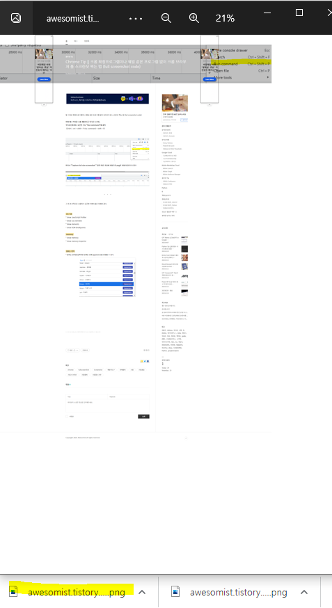 여기서 "Capture full size screenshot " 입력 하면 하단에 자동으로 png로 자동다운로드가 된다