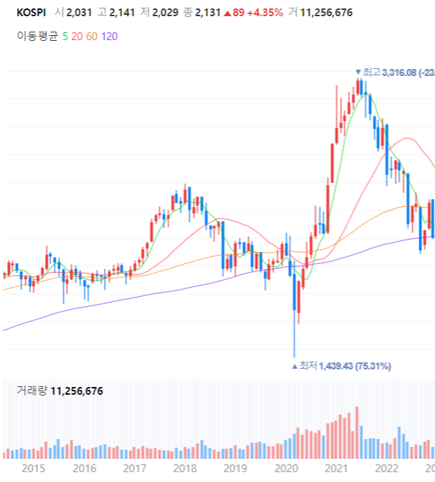 * 월봉 기준 - [최저점] 419.55 (2020.03) 터치는 맞았으나 바닥 확인 없이 코스피랑 동일하게 추이 상승