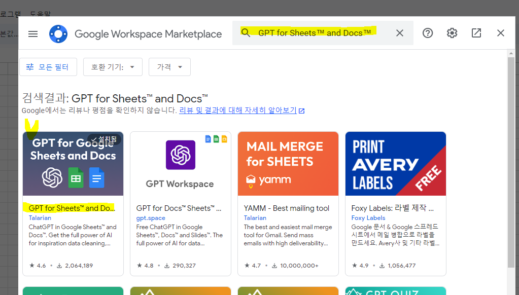 [ GPT for Sheets™ and Docs™ ] 검색 설치