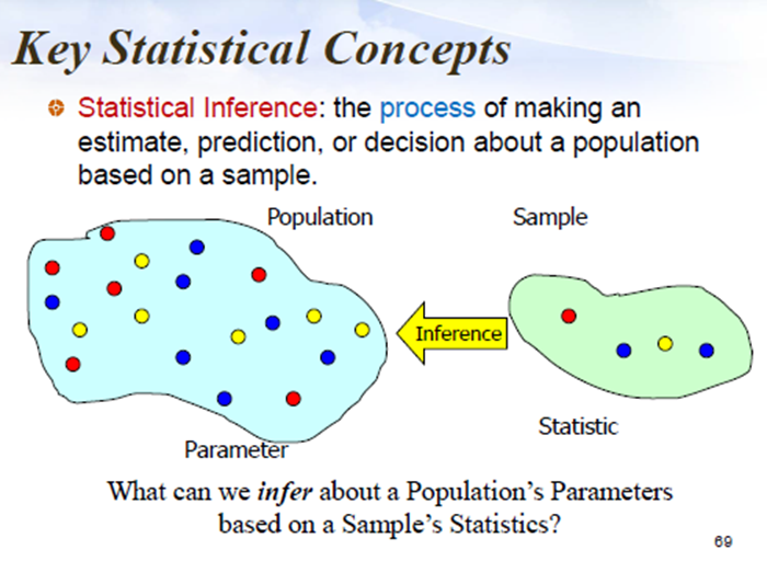 추출하여 그 표본의 특징(통계량, statistic)을 분석해 전체의 값(모수, Parameter)을 도출하는 것