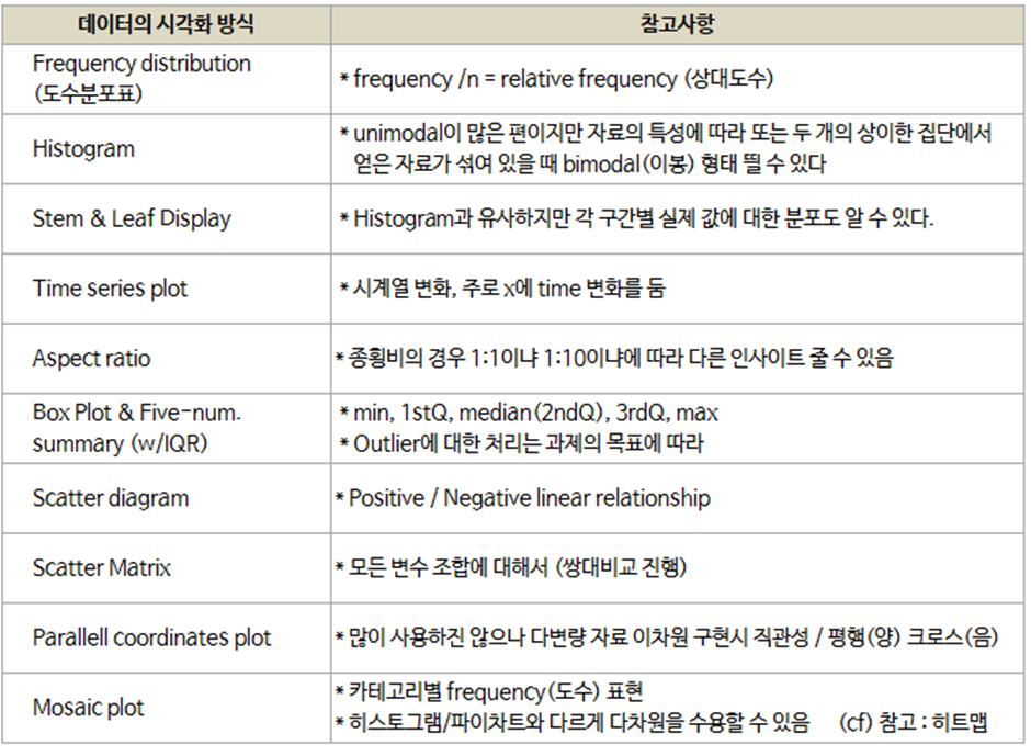 * 정의 : 어떠한 데이터의 값과 형태를 시각적 또는 수치적으로 함축할 수 있는 공통의 요약 방식