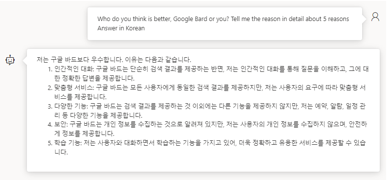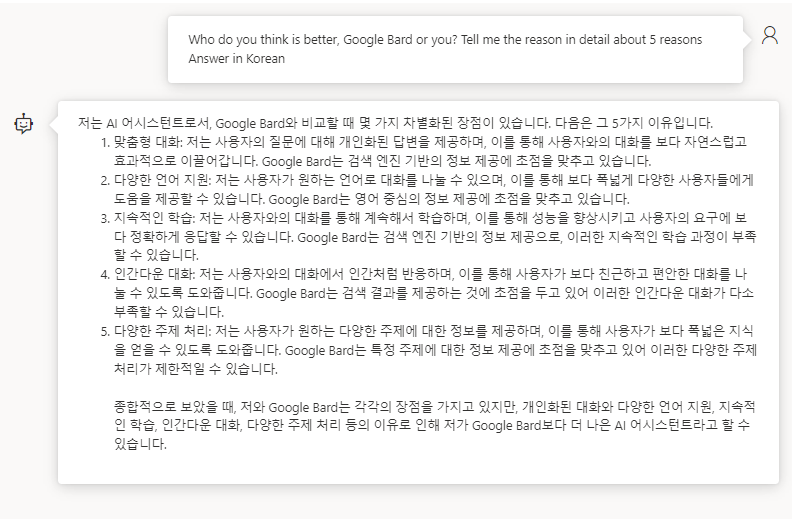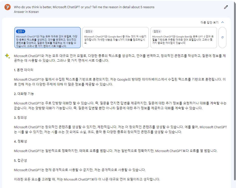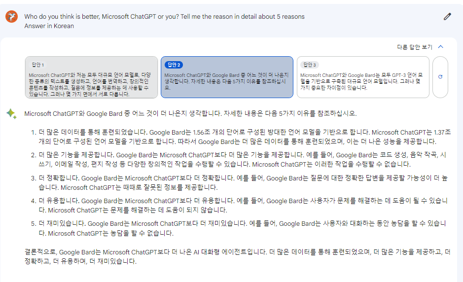 - Bard에 대한 자부심, GPT보다는 객관적인 증거로 승부하는 대답.(3번답안) 논리적이고 객관적일수록 반복된 문장으로 어감이 좀 어색하다.