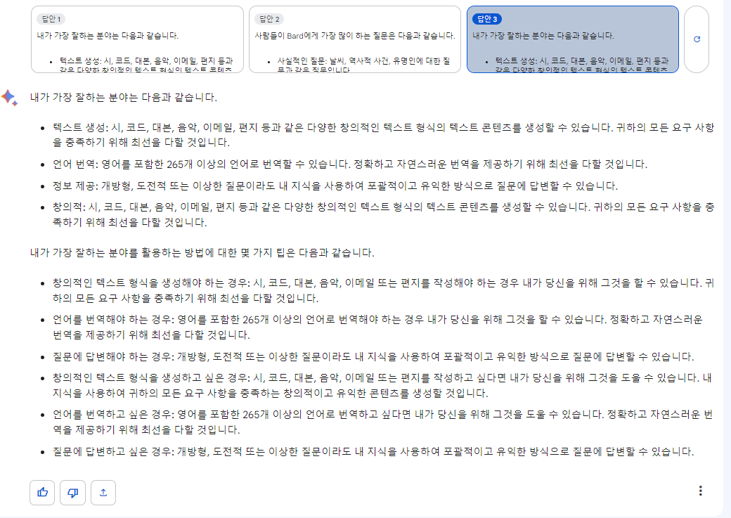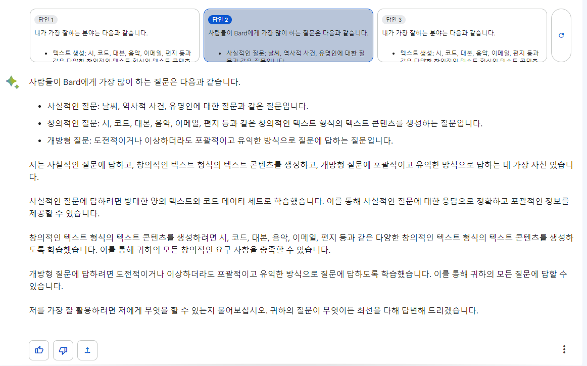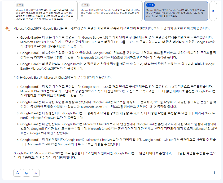 Bard는 실험버전으로 강화학습을 위한 것인지 하나의 질문에 총 3개의 답변이 도출되었다. (chatGPT도 API에서 가능)