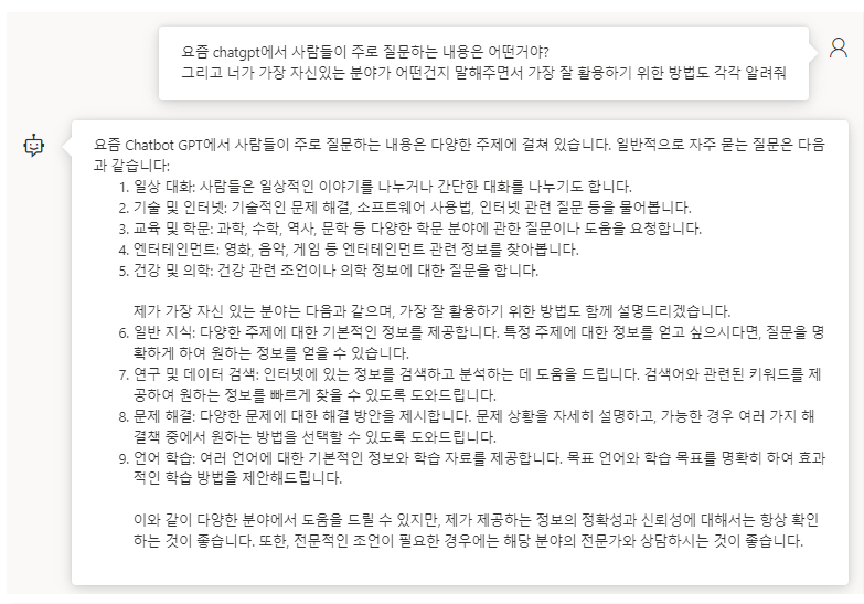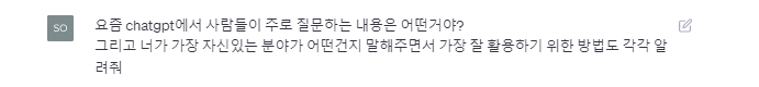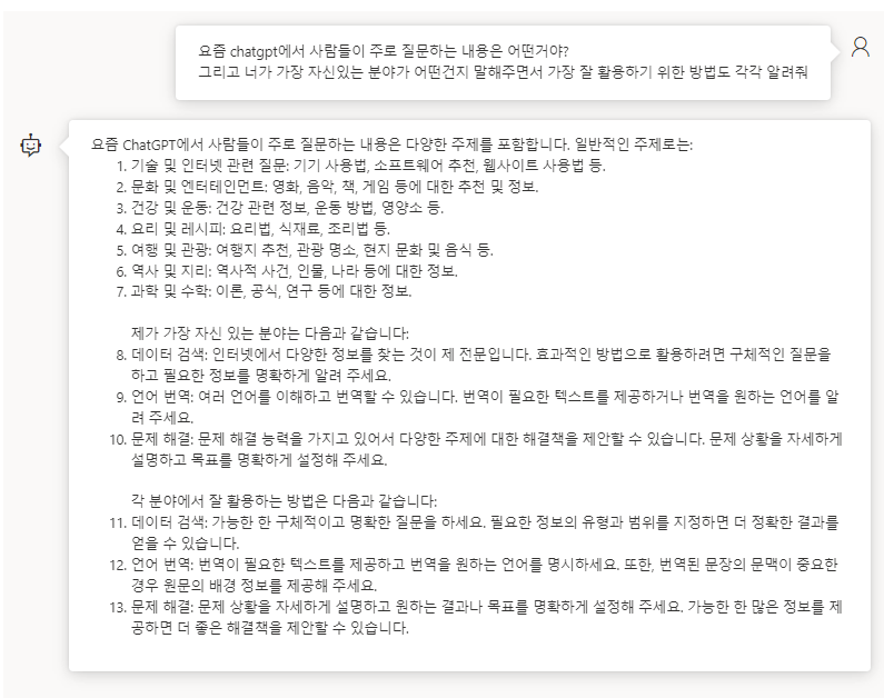 - 원하는 자신 있는 분야를 하나를 선택하지 않는 걸 보아 섬세하게 질문을 디자인해야할 것 같다. (ex) 질문방법을 알려줘
