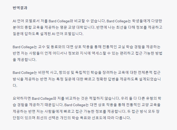 - 개인적으로 번역어라도 text-davinci-003의 자연어 응답을 더 선호하기도 한 탓이겠지만 문장이 썩 마음에 들지 않는다.
