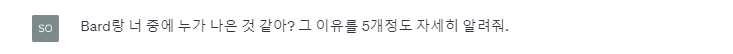1) Bard는 후발주자기도 하고 구글 어시스턴트도 관리하고 있으니이것만큼은 좀더 센스 있는 대답을 기대할 수 있지 않을까 싶었다.