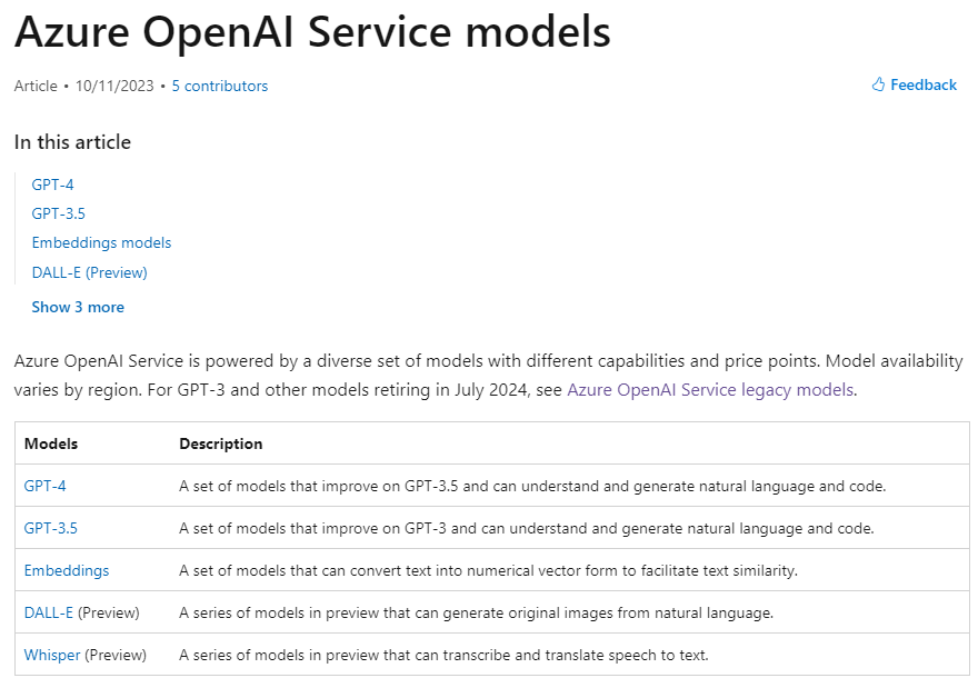 Awesomist 2023. 10. 12. 16:28Azure에서는 최근까지 업데이트 되었던 아래 5개 모델 외