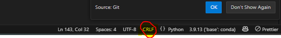 VS Code 우측하단에서 CRLF를 LF 변경하면 되긴 하지만 일일이 파일 모두 세팅해줘야하는 경우들이 발생해서